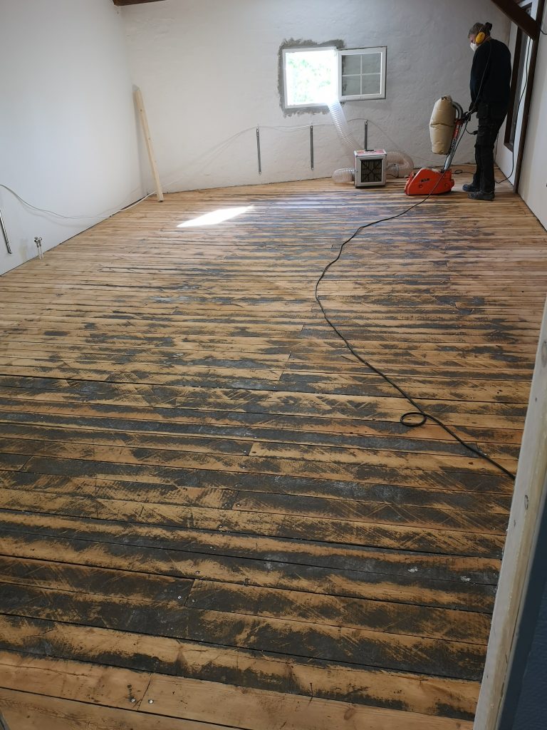 Golven har slipats, inte slipats om, utan slipats för första gången någonsin. Den gyllene kulören i träet och de nedslipade spikarna vittnar om åldern. I en ateljé tog de som hyrde den hand om renoveringen själva. Där har golvet kvar mycket av den svärta hela andra planet hade tidigare.